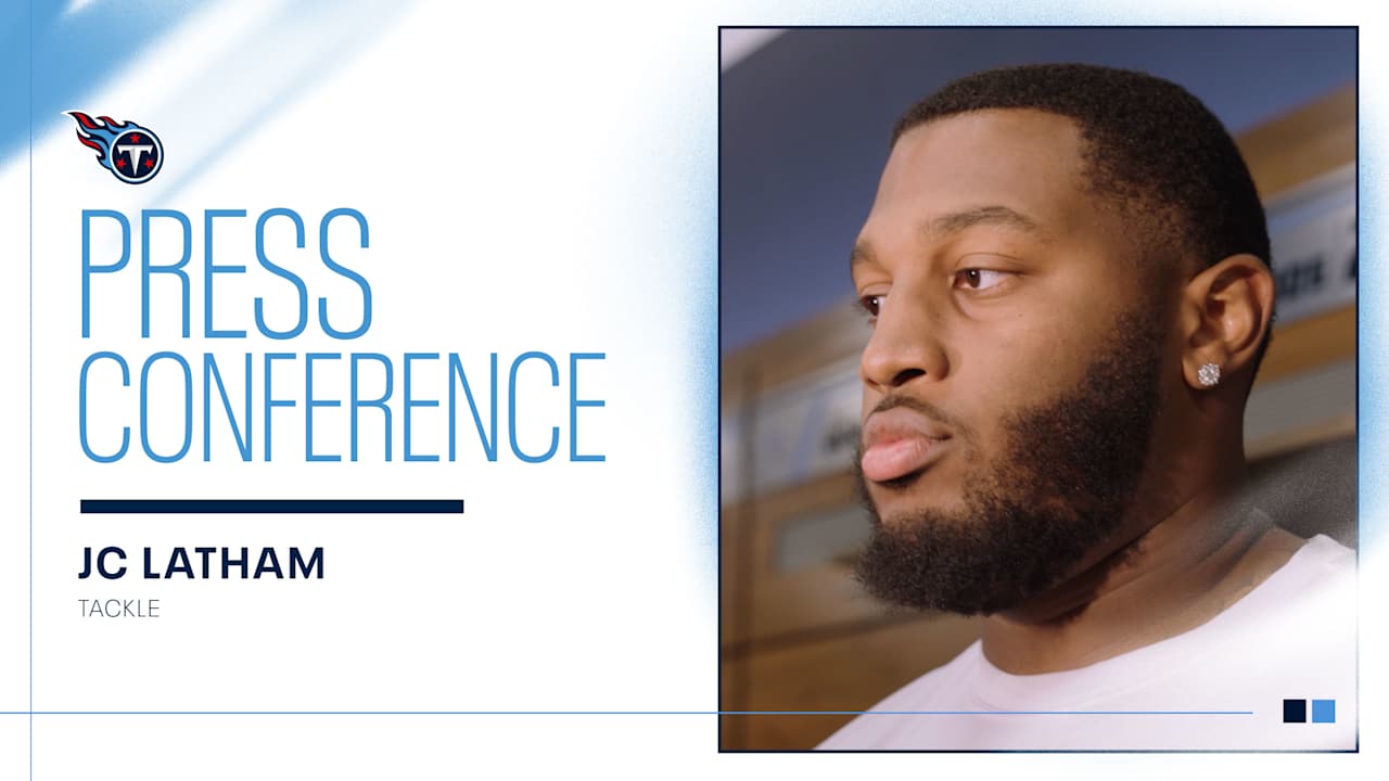 Titans T JC Latham addresses reporters on Wednesday at Ascension Saint Thomas Sports Park.