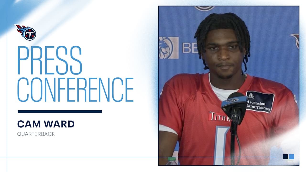 Titans OLB Jihad Ward addresses reporters on Monday at Ascension Saint Thomas Sports Park.