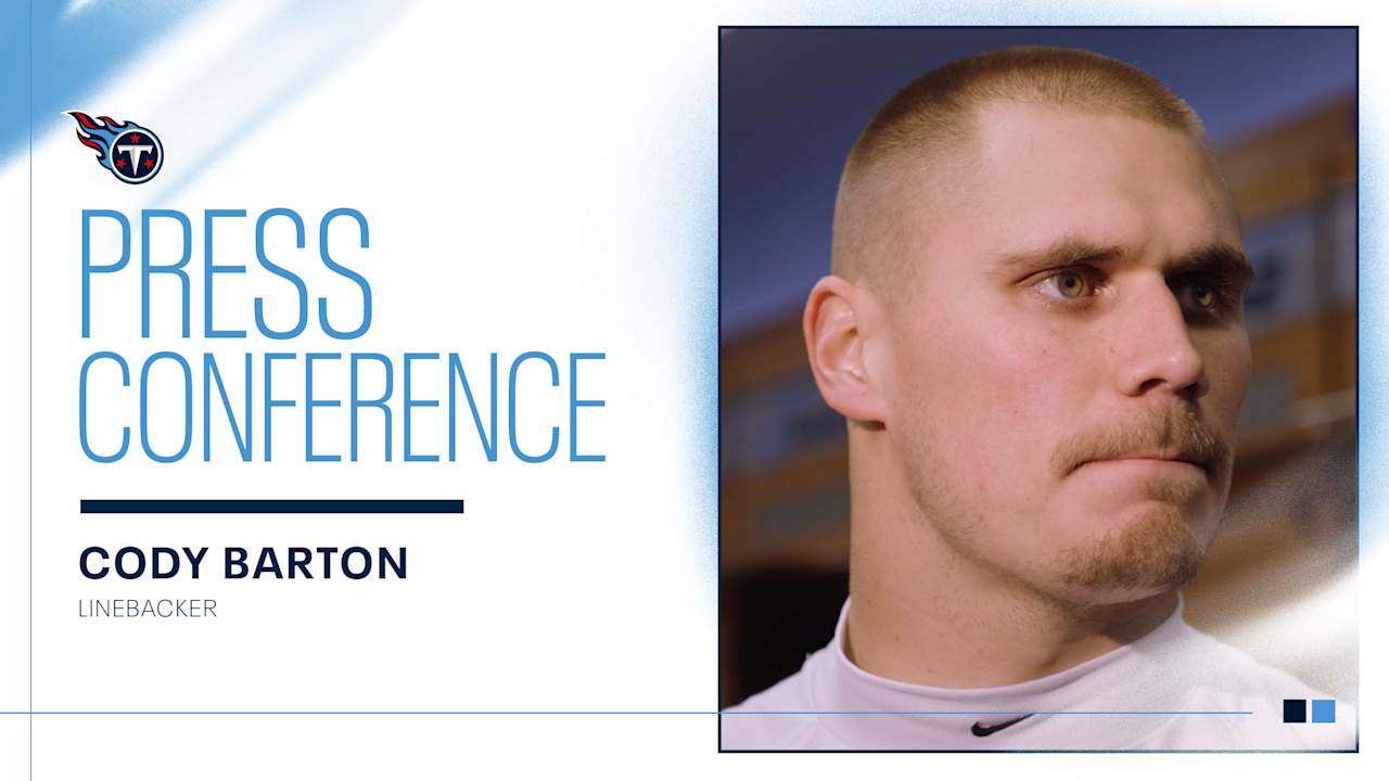 Titans LB Cody Barton addresses reporters on Wednesday at Ascension Saint Thomas Sports Park.